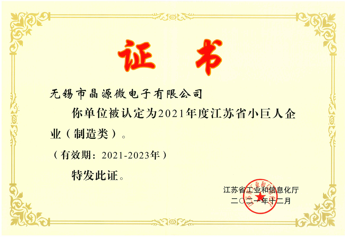 专精特新小巨人企业证书